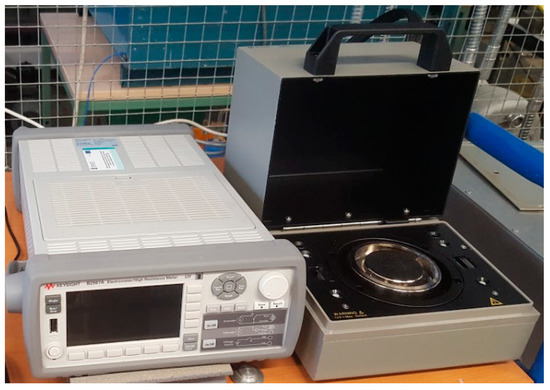 The investigations of new types of materials should be performed on basic test samples in the form of flat samples. This kind of shape provides a uniform electrical field distribution in the tested material’s volume. Determination of the (1) volume and (2) surface resistivity of the flat solid dielectric materials was made in accordance with the IEC 62631-3-1, IEC 62631-3-2 and IEC 61340-2-3 standards [44,45,46]. The test stand used in the investigations consisted of the electrometer KEYSIGHT B2987A and Resistivity Cell (16008B) (Figure 4) equipped with normalized electrodes [47]. The electrometer could provide DC voltage up to ±1000 V; this voltage was used in the test to provide the electrical field in the test sample in the range of 1 kV/mm. The measured resistance was converted to volume or surface resistivity (Figure 4). The duration of the measurements was 180 s; it was assumed that after this time the polarization processes were negligible.