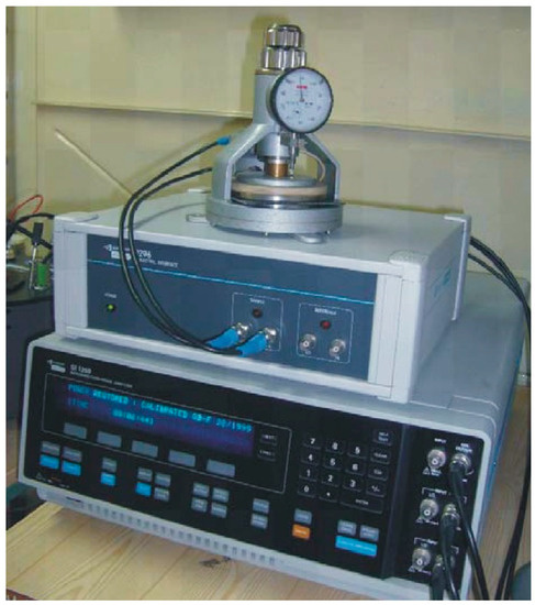 The investigations also covered some non-standardized testing procedures with the frequency dielectric spectroscopy (FDS) method. This method is used for permittivity and dissipation factor determination as a function of frequency. The laboratory stand was equipped with a Frequency Response Analyzer Solartron 1260 with a 1296 dielectric interface (Figure 5). This system is suitable for oil–cellulose material characterization in comparative tests. The measurements for the sample’s characterization were performed for frequencies in the range of 10 mHz to 1 kHz. The test voltage was set to 3 Vrms.