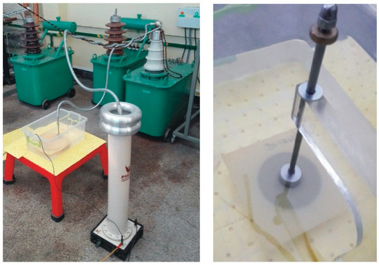 The second group of dielectric measurements were the destructive test, which aimed to determine the dielectric withstand and partial discharge presence. The tests were carried out in accordance with IEC and ASTM standards (IEC 60243-1 [50], D 149-09 [51]). The testing specimen consisted of two profiled stainless-steel electrodes (with diameters 25 mm/75 mm) (Figure 6). The slow-rate-of-rise voltage method was applied. The test stand consisted of a Voltage Test Transformer TP60 with a maximal voltage rating of up to 60 kV, a Phoenix KiloVolt meter and test electrodes. Due to the high value of breakdown, the voltage test samples with the electrode system were placed in insulation oil. Before breakdown, voltage partial discharge measurements were performed.