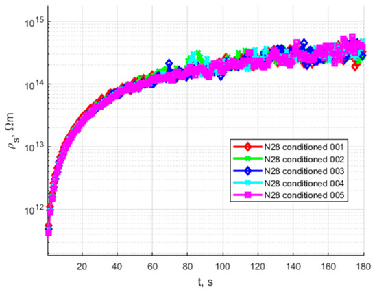 Time characteristics of volume resistivity of N28 sample before conditioning process.