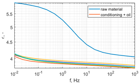 The ambient conditions during measurement were as follows: temperature 21 °C, air humidity 24%, pressure 999 hPa. Two sets of samples were tested, first raw material samples without oil and before conditioning, then conditioned samples immersed in oil. The measurements of the dielectric properties of the raw materials gives information on the developed material and used technology. The conditioned samples imitate the target application of the developed material.