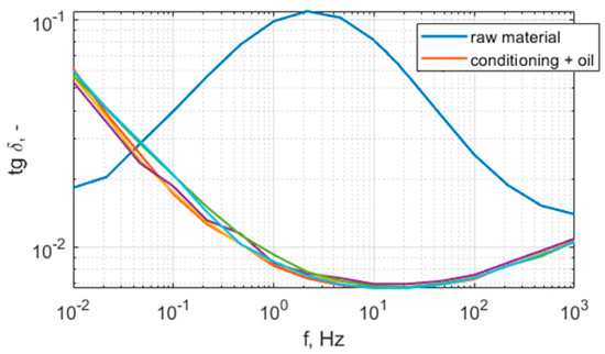 Figure 10 and Figure 11 present the relative permittivity and dissipation factor characteristics of the raw and conditioned samples. The summary of the averaged results for 50 Hz are presented in Table 3. As can be seen, the raw material has a higher permittivity and dissipation factor than the conditioned samples. Taking into consideration the results of volume resistivity and the characteristics of permittivity and dissipation factor, it can be concluded that the raw sample has moisture in its cellulose filler. Thus, it should be conditioned before application as part of a high-voltage insulation system. The conditioning process removes bound water, the dielectric constant of which is approx. 80; this is reflected in the lowering of the permittivity, especially in the low-frequency region. During conditioning, the maximum of the dissipation factor moves to the lower frequencies, which is also related to the removal of moisture from cellulose. The thickness of the materials is not uniform, thus there is a visible dispersion of results. The repeatability between conditioned samples is fair, the maximal difference between dielectric constant values is 2%, and the difference between dissipation factors is 4%.