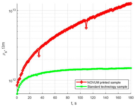 Time characteristics of volume resistivity of N28 printed sample and standard technology sample.