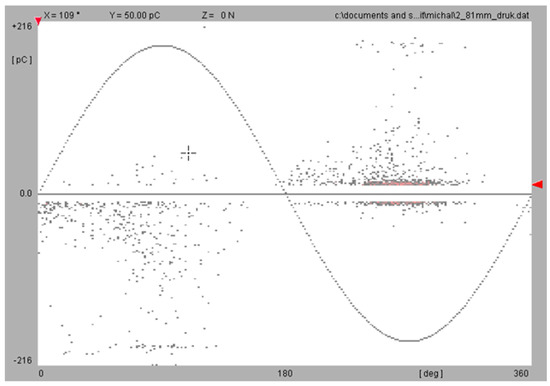 The last classification of dielectric properties for the N28 material was to check for the occurrence of partial discharges and determine the breakdown voltage, which is the basis for dielectric strength calculation. Partial discharges are unpleasant phenomena because they speed up the aging process of the insulation system, provide additional power losses and cause radio disturbances. In the worst case, they can cause damage to the insulation before the assumed time of life. The origins of partial discharges can be different; most commonly, they are air voids in solid dielectrics or metallic intrusions provided during the manufacturing process. The measurements were performed on conditioned samples immersed in oil.