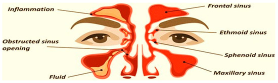 Sinusitis is a very common condition affecting the nasal mucosa and paranasal sinus (PNS). It is a condition in which the air-filled sinuses become chronically inflamed, obstructing natural fluid drainage and causing unbearable facial pain [1,2]. The preferred term is rhinosinusitis, as sinusitis most often goes together with inflammation of the contiguous nasal mucosa. The normal sinus versus inflamed sinus, blocking fluid drainage, and classification of rhinosinusitis are represented in the schematic diagram, in Figure 1 and Figure 2, respectively. Approximately 15% of the Indian population suffers from this condition. Endoscopic sinus surgery (ESS) is a surgical approach to this condition where the inflamed, diseased tissue is surgically removed. Post-surgical treatments include douching, various topical and oral anti-inflammatory drugs, and antibiotics [3,4].
