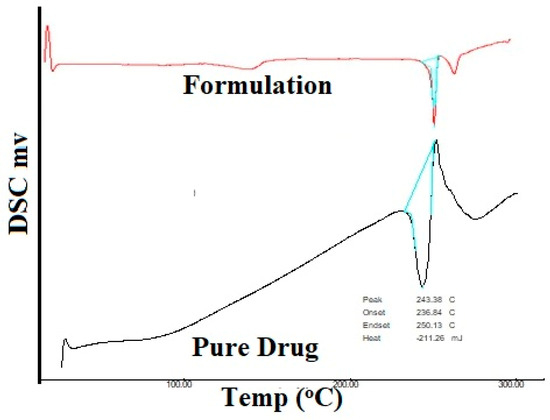 DSC thermograms of a pure drug sample and an optimized formulation sample are represented in Figure 9. The DSC curve of MF shows two events. One endothermic event at 243.38 °C which is consistent with the prior literature, and an exothermic event at approximately 260 °C. The DSC curve of the optimized formulation also shows one endothermic event at 249.01 °C and an exothermic event at approximately 260 °C. The energy consumed by pure MF is −211.26 mJ and the energy consumed by the formulation is −187.51 mJ. With the energy consumed by both samples being almost similar and the endothermic events on both pure drug and the final formulation being very similar, it can be concluded that the polymer and the drug show good compatibility.