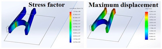 To accomplish this experiment, the structure was first imported into the software, and the material used (in this case, PLA) was selected. Then the structure was provided with fixed supports, and the force was adjusted. Then, the software helps in solving according to all the set criteria, which will result in stress, strain, and deformation. The same procedure is followed in calculating the maximum displacement [22].