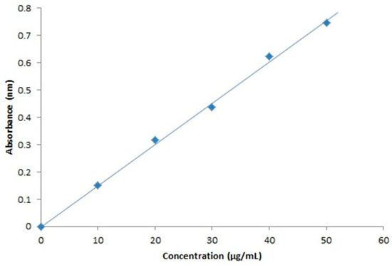 The standard calibration curve indicates that the drug obeys Beer’s law. The optimized result could be found around 10–50 µg/mL. The concentration of the drug was calculated using the linear regression equation (R2 = 0.996) as shown in Figure 12.