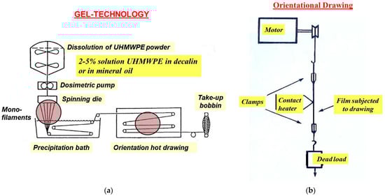 Fabrication of high-strength UHMWPE fibers (a) by gel-technology in industry and (b) by multi-stage hot-zone drawing technique using a home-built laboratory device.