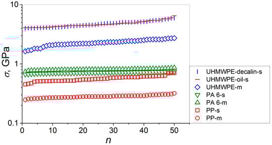 Semi-log plots of tensile strength σ as a function of sample number n in ascending order for single (-s) and multifilament (-m) film threads and fibers of UHMWPE, PA 6, and PP.