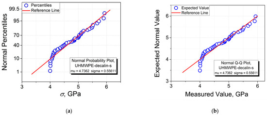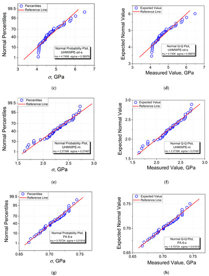 As follows from the normal probability and quantile–quantile plots, qualitatively, they have a linear shape for the samples of UHMWPE-m (see Figure 3e,f), PA 6-s (see Figure 3g,h), PA 6-m (see Figure 3i,j), PP-s (see Figure 3k,l), and PP-m (see Figure 3m,n), while those for the samples of UHMWPE-d-s (see Figure 3a,b) and UHMWPE-o-s (see Figure 3c,d) demonstrate the deviation from linearity at smaller strengths. Therefore, it may be concluded from the graphical analysis performed that the normal distribution seems not to be appropriate in the two latter cases.