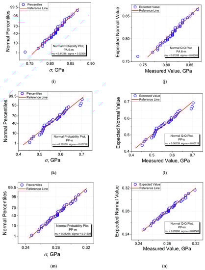 Comparing the results obtained when constructing the normal probability plots with those of the corresponding quantile–quantile plots, it is seen that, as expected, the two graphical procedures give one and the same values of “mu” (σav) and “sigma” (SD) for all the samples investigated. For instance, for the PP-m sample, one obtains σav = 0.28268 GPa and SD = 0.01508 GPa (see Figure 3m,n). Therefore, any of these plots can be chosen for a comparative analysis including the estimation of σav and SD.
