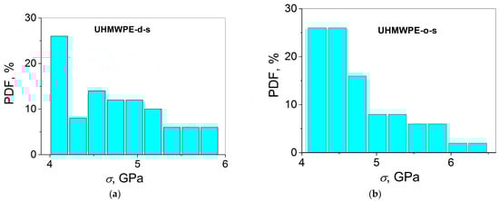 Probably, the exceptions found indicate that those tests are most appropriate for the investigated samples since the UHMWPE-d-s and UHMWPE-o-s samples, especially the latter, demonstrate the skewed distributions (see Figure 4a,b) which are not reminiscent of the classical Gaussian bell curve.