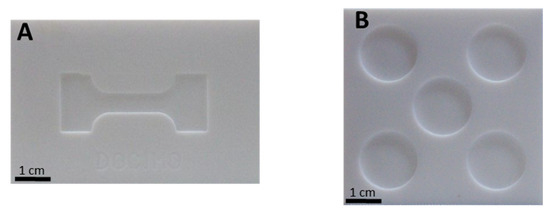 Mold characterized by a dog-bone shape for the Tensile Test (A) and mold with disc shape for the Rheological Test (B); scale bar = 1 cm.