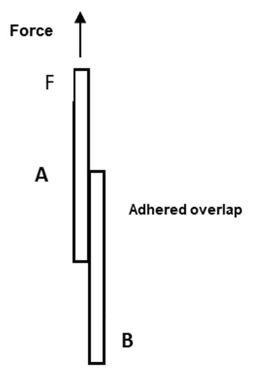 The bonding strength of adhesive–substrate samples was measured by means of an Instron Machine (mod. 5566) using a load cell of 100 N. In particular, the free surfaces of the substrates (A and B) were placed between the grips of the Instron machine and the shear force was applied by pulling the substrate A at an extension rate of 1 mm/min (Figure 2). This method was adapted from the ASTM International Standard D2339-98 “Standard Test Method for Strength Properties of Adhesives in Two-Ply Wood Construction in Shear by Tension Loading”. The separation force, obtained by the dynamometer, was divided by the contact area to yield the shear strength Σ. The tests were repeated at least three times on each sample.