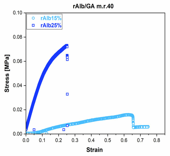 A representative stress–strain curve obtained by tensile tests of CL–rAlb gels with an rAlb concentration of 15% or 25% and an rAlb/GA m.r. of 40 is shown in Figure 3. Typically, the stress–strain curve shows three regions: The first is a non-linear region in which the material shows a high deformation when applying a low stress [24]. This behavior could be explained by considering a possible rearrangement of polymeric chains within the gel. The second part of the curve is characterized by an elastic response of the material, showing a linear relationship between the applied stress and the deformation of the material, while the third part of the curve is a plastic region until a maximum stress value is reached. After this value, there is a sudden reduction in stress, meaning that there was breakage of the sample. The maximum stress values, σ max, for all samples is reported in Table 2.