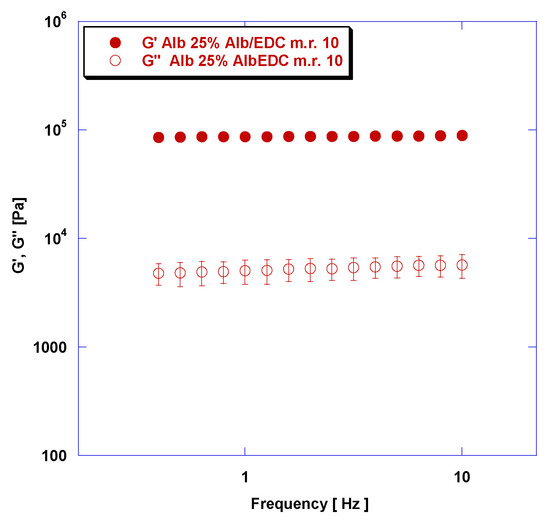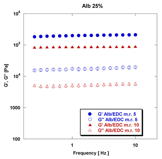 A representative mechanical spectrum, which shows the dependence of G′ and G″ as a function of frequency for rAlb-based gels, is reported in Figure 4.