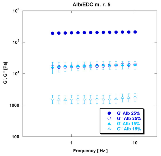 The elastic and viscous moduli of samples at an rAlb concentration of 25% and an rAlb/EDC mass ratio of 5 and 10 are reported in Figure 6. From this representative figure, it can be observed that decreasing the rAlb/CL mass ratio while keeping the rAlb concentration constant leads to an increase in the viscoelastic properties of the gels. In particular, as reported in Table 3, at an rAlb concentration of 15%, the values of G′ and G″ at a frequency of 5 Hz are 2.44 × 104 MPa and 2.13 × 103 MPa for the sample with an rAlb/GA mass ratio of 20, and 1.89 × 105 MPa and 1.34 × 104 MPa for the sample with an rAlb/GA mass ratio of 40. Thus, decreasing the rAlb/GA mass ratio from 40 to 20 increases the value of G′ by one order of magnitude.