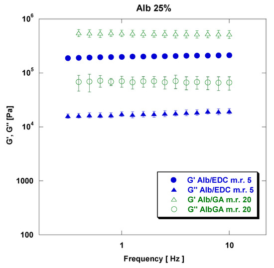 Figure 7 reports the comparison between the mechanical spectra obtained from samples crosslinked with EDC at an rAlb/EDC mass ratio of 5 (rAlb/EDC mole ratio of 0.015) and samples crosslinked with GA at an rAlb/GA mass ratio of 20 (rAlb/GA mole ratio of 0.030), at an rAlb concentration of 25%.