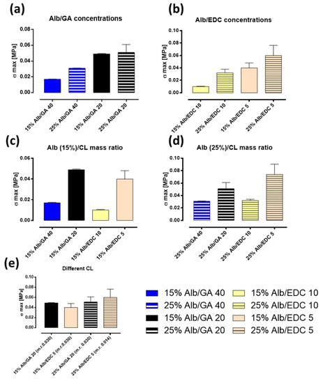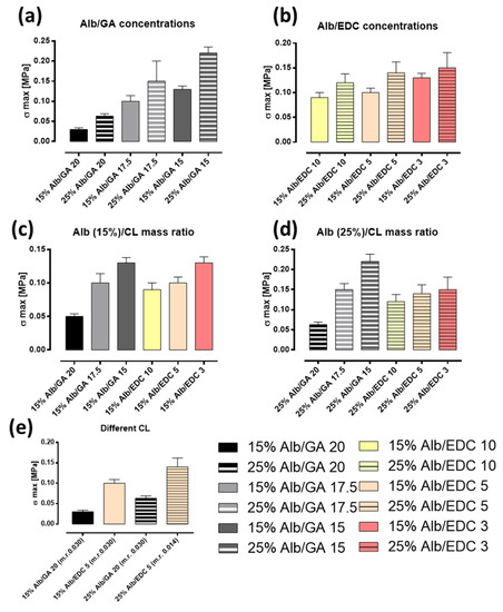 For both types of crosslinkers and for different alb/CL mass ratios, increasing the rAlb concentration increases the maximum stress value. In particular, when EDC is used as the crosslinker, for samples having an Alb/CL m.r. of 10, increasing the rAlb concentration from 15% to 25% increases the σmax from 4 × 10−2 ± 1 × 10−2 to 6 × 10−2 ± 2 × 10−2 MPa, respectively, while for samples having an Alb/CL m.r. of 5, the σmax increases from 1 × 10−1 ± 1 × 10−2 to 3 × 10−1 ± 2 × 10−2 MPa. Similarly, when using GA as the crosslinker, the increase in rAlb concentration from 15% to 25% results in an increase in σmax from 2 × 10−2 ± 1 × 10−2 to 7 × 10−2 ± 1 × 10−2 MPa, respectively, when the Alb/CL m.r. is 40, and from 1 × 10−1 ± 2 × 10−3 to 2 × 10−1 ± 3 × 10−2 MPa when the Alb/CL m.r. is 20. The increase in rAlb/CL mass ratio implies a decrease in the maximum stress value for both types of crosslinkers and for both rAlb concentrations. In particular, considering EDC as the crosslinker, increasing the rAlb/CL m.r. from 5 to 10 decreases the maximum σmax stress from 4 × 10−2 ± 1 × 10−2 to 1 × 10−1 ± 1 × 10−2 MPa for the samples at an rAlb concentration of 15% and from 6 × 10−2 ± 2 × 10−2 to 3 × 10−1 ± 2 × 10−2 MPa when the rAlb concentration is 25%. When GA is used as crosslinker, the σmax decreases from 2 × 10−2 ± 1 × 10−2 MPa (alb/CL m.r. of 40) to 1 × 10−1 ± 2 × 10−3 MPa (alb/CL m.r. of 20) for the samples at an rAlb concentration of 15%, and from 7 × 10−2 ± 1 × 10−2 (alb/CL m.r. of 40) to 2 × 10−1 ± 3 × 10−2 MPa (alb/CL m.r. of 20) for the samples at an rAlb concentration of 25%. Furthermore, the rAlb-based gels prepared using GA reach lower maximum stress values and lower deformation at break in comparison with the samples prepared with a high mass ratio of EDC.
