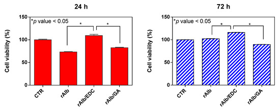 In order to investigate the biocompatibility of the gels, HDF cell viability was evaluated by the Alamar Blue assay. The metabolic activity of the cells was measured at 24 and 72 h of cell culture. The irreversible reaction of resazurin to resorufin, which takes place during this test, provides an indirect indication of the cell viability over the time points. As can be observed from Figure 10, the gels showed good biocompatibility after 24 h and 72 h of cell culture compared with the control. Indeed, gels showed a cell viability percentage of approximately 70% for rAlb alone, 100% for rAlb/EDC and 80% for rAlb/GA at 24 h of culture. After 72 h, the cell percentage viability was higher compared with the 24 h time point: all samples showed a cell viability percentage of approximately 100% due to the increase in proliferation of the cells. In any case, the cell viability percentage after 24 h and 72 h was higher in the sample with rAlb and EDC as the crosslinker compared with rAlb alone or rAlb with GA as the crosslinker. Biocompatibility is an important criterion for the applicability of a tissue sealant. This is more relevant for the CL sealant as degradation products of this crosslinking agent have been shown to produce foreign body reactions [33]. GA is a widely used crosslinking agent for improving the mechanical properties and resistance to enzymatic degradation of biomaterial devices, but several drawbacks such as calcification and cytotoxicity have been reported [34]. It is well known that EDC modifies side groups on proteins, making them reactive with other side groups and mediating the ester bond formation between the hydroxyl and carboxyl groups. In contrast to conventional chemical agents such as GA, EDC does not remain as a part of that linkage but simply changes to water-soluble urea derivatives. Thus, the use of EDC should not present cytotoxic effects, and these residues can be metabolized by the cell [33]. These results are in accordance with the literature and demonstrate that the use of EDC as a crosslinker is preferable to maintain an optimal level of biocompatibility of the cells compared with the use of GA as a crosslinking agent [35,36].