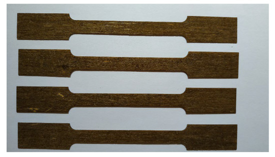 Mechanical analysis of bio-based composite was carried out on a Shimadzu traction machine with a 50 kN capacity load, displacement rate of 2 mm·min−1, with laboratory conditions of 23 °C and 65% relative humidity, and conducted at Unilasalle Rouen (Mont-Saint-Aignan, France). Tensile specimens were prepared according to ISO 527 (Figure 2) and cut with a Mllaser ML-W1290.