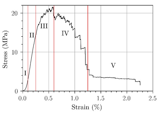 - The 3rd area (starting at approximately 0.3% of elongation) is characterized by a sudden decrease of the stress-strain curve and is associated with a sequential breaking of the fibers as reported elsewhere [14,30].