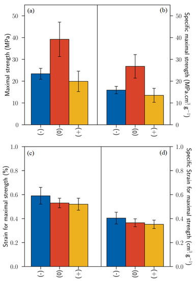 Tensile tests for scutched flax band fibers versus the retting applied (a) Maximal strength, (b) Specific maximal strength, (c) Strain for maximal strength, (d) Specific strain for maximal strength. Error bars represent the standard deviation.