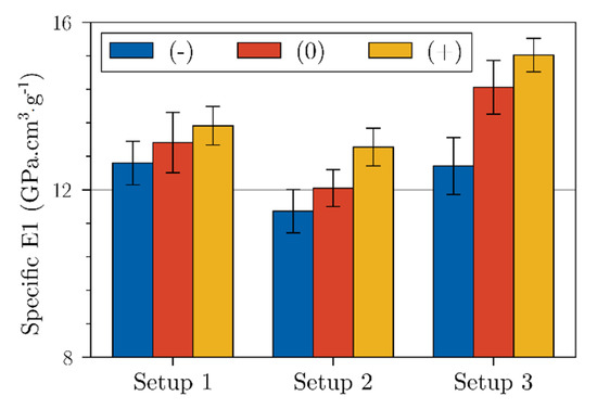 Figure 7 shows specific E1 modulus of our bio-based materials. We observed a positive effect of retting on the specific tensile modulus, the lowest moduli were obtained for materials made with the Setup 2 and the highest ones obtained with the Setup 3 (+). We should note that the density of flax-based materials was impacted by the processing (p-value = 1.80 × 10−2). Setup 3 provided the densest bio-based materials with an average of 1.29 g.cm−3. As indicated in Table 4, the density increasing could be associated with the higher processing temperature, favoring the fiber content and decreasing the internal porosity content [13]. Both the combined effects of retting and the Setup 3 parameters led to a higher tensile modulus, related to the fibers’ individualization (cleaner fiber surface) which favors a better interfacial adhesion with matrix. Moreover, the higher crystallinity rate of the retted fiber also contributed to this mechanical response.