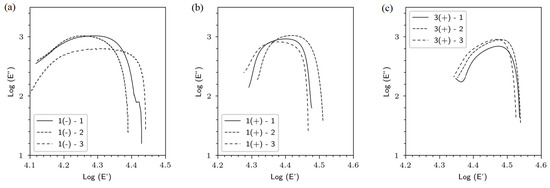 Cole-Cole diagrams of (a) 1(−), (b) 1(+) and (c) 3(+) bio-based materials.