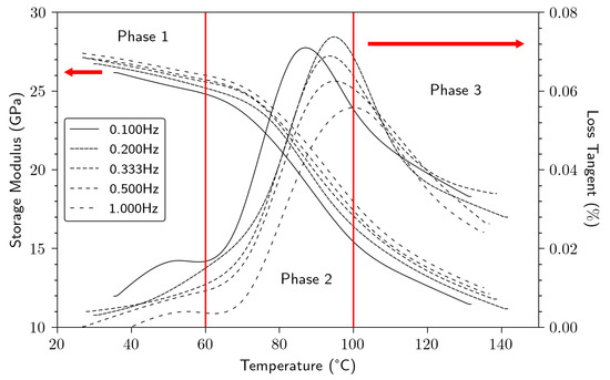 - Phase 1, when T < 60 °C, characterized by a dominant elastic behavior (E′ > E″). Moreover, we notice a slight loss of the E′ modulus with the temperature increase. It is a typical behavior of a thermoset composite in a glassy state [38,39].