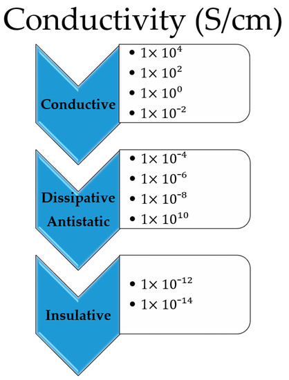 The next major advancement in technology in the contemporary period will likely be wearable electronics and conductive materials, which will surpass portable devices. Conductive fabrics can be utilized to incorporate sensors capable of sensing and responding to external stimuli [1,2,3,4,5]. The stimuli and responses can have a variety of causes, including chemical, thermal, magnetic, and electrical [1]. The development of lightweight, flexible parts and fibrous structures with a high electrical conductivity that can withstand the stresses of wearing, and caring for the textile is a critical obstacle to the success of wearable e-textile technology [2,6]. In fact, there are several obstacles to be overcome in the quickly expanding field of electronic textiles, or e-textiles, due to the rigidity and weight of metallic conductors [2,7]. Electrostatic discharge terminology glossary (ESD ADV1.0) defines conductive materials as “a material that has a surface resistance of less than 1.0 × 104 Ω or volume resistance of less than 1.0 × 104 Ω”. In order to combine electronic devices, such as sensors [8,9,10,11,12], antennas [7,13], and energy storage devices [14,15,16], new technology has been used in textile construction. Electrostatic discharge (ESD) is a very common and easily attainable phenomenon in the realm of alternative nonmetal-based conductive fabrics [17,18,19,20]. Components for smart textiles need to have a conductivity that is significantly higher than the electrostatic discharge range to replace metallic conductors in fabrics that effectively transmit information and support computing. According to the ESD Association standard [21], dissipative materials have conductivities between 1 10−11 S/cm and 1 10−4 S/cm. Contrarily, conductive materials are those that have conductivity greater than 1 10−4 S/cm (Figure 1). To create lightweight materials that potentially replace metallic fabrics, higher conductivity must be combined with good mechanical qualities [21].