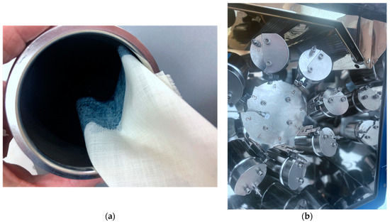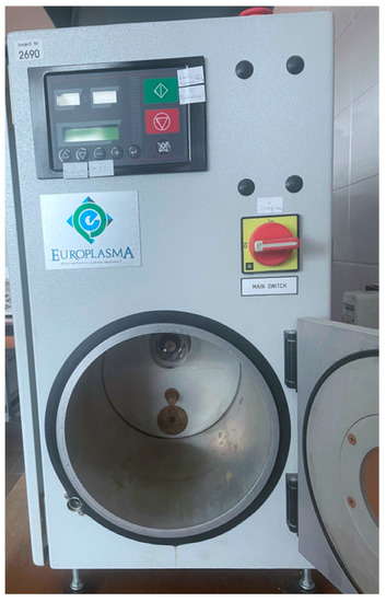 A 100% wool fabric used as the substrate for this research was acquired from JSC “Drobė” (Kaunas, Lithuania). The Junior Plasma System 004/123 (Europlasma, Oudenaarde, Belgium) is a low-pressure plasma apparatus that was used to modify the wool fabric samples with N2 gas. The chosen process parameters were as follows: processing duration of 3 min, pressure of 0.4 mbar, discharge power of 200 W, and N2 gas flow of 0.01 L/min (Figure 2).