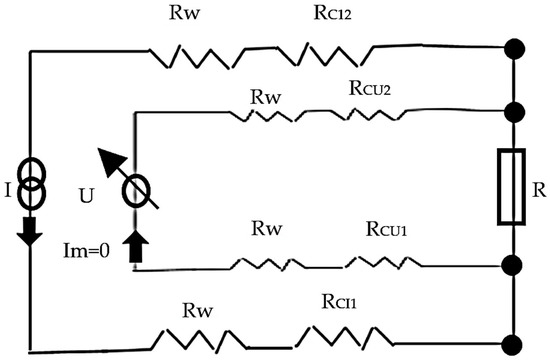 RCI1 and RCI2 are the contact resistances in the current circuit in ohms; RCU1 and RCU2 are the contact resistance in the voltage circuit in ohms; RW is the wire resistance in ohms.