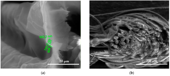 SEM images show the differences between unmodified and modified plasma wool samples with different coating combinations, according to Table 1. SEM images show that when comparing the samples without (S) and after plasma modification (PS, PFS), the thickness of the sample (S) coating is thinner at 0.552 ÷ 0.743 µm, uneven, and delaminated (Figure 7a,b), but after plasma modification of the sample (PS) we obtain a thicker coating 1.251 ÷ 1.416 µm, the sample is ignited more evenly, and the spaces between the threads are filled with a coating (Figure 8a,b) [37]. After plasma modification of samples (PFS) (Figure 9a,b), the coating is thicker at 1.193 ÷ 1.947 µm and more equal and well penetrated on the other side of the fabric in comparison to samples (PS) [38,39,40] without initial dyeing, the coating is only formed and visible on the surface (Figure 8b). Comparing samples without (S, PS, PFS) and with Tubicoat fixing agent HT (FSH), the coating thickness is 1.662 ÷ 2.187 µm (Figure 10a,b) and looks more homogeneous and uniform than without Tubicoat fixing agent HT (Figure 7, Figure 8 and Figure 9).