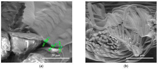 SEM images of the wool fiber cross-section sample (PFSH) N2 plasma-treated Clevios F ET dyed and Clevios S V3 with Tubicoat fixing agent HT screen printing method coating; magnification 5000× (a) and 500× (b).