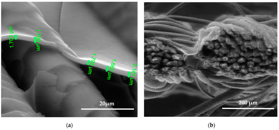 SEM images of the wool fiber cross-section sample (PFS) N2 plasma-treated Clevios F ET dyed and Clevios S V3 screen printing method coating; magnification 5000× (a) and 500× (b).