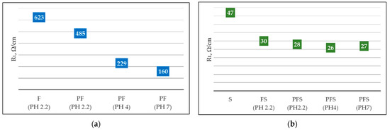 Comparison of plasma (160 Ω/cm) and no plasma (623 Ω/cm) treatments of wool fabrics (Figure 11a) resulted in an approximately 4 times lower linear resistance (RL). The pH change (2.2, 4, and 7) dyeing with Clevios F ET alone resulted in the lowest resistivity at pH 7 (160 Ω/cm) and was not influence the resistivity of newly formed coating with Cevios S V3 (Figure 11b). Plasma treatment, dyeing, and coating with PEDOT:PSS (sample PFS) resulted in almost a factor of two times lower linear resistivity measurements (26 ÷ 28 Ω/cm) compared with only coating Clevios SV 3 (sample S) (47 Ω/cm) (Figure 11a,b). Since changing the pH did not significantly affect the linear resistance reduction, we did not change the pH in further tests and used the original Clevios F ET.