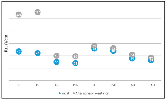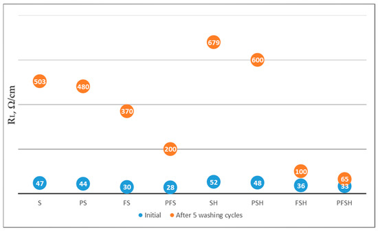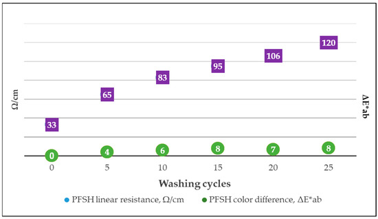 The sample PFSH with the best resistance to rubbing and washing was selected, and additionally, 25 washing cycles were carried out, measuring the linear resistance and color differences after every five washing cycles. The value of ∆E*ab shows that the magnitude of the color differences after the washing cycles is not very wide; after 15 washing cycles, the value remains almost constant at ∆E*ab of approximately eight. Moreover, the RL of sample PFSH before washing was 33 Ω/cm (Figure 15). The RL steadily increased to 120 Ω/cm when the 25 washing cycles were carried out, but the material was still electrically conductive (Figure 15) and could be classified as a dissipative material and used for protective workwear [59].