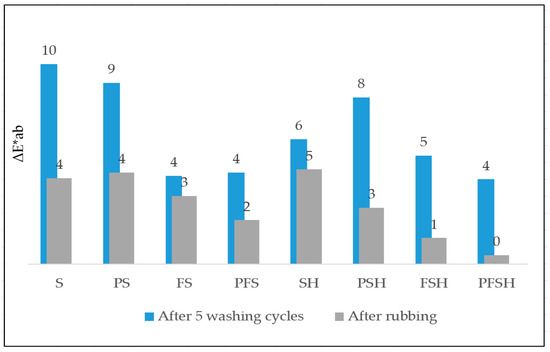 Samples (S, PS, FS, PFS, SH, PSH, FSH, PFSH) of the wool fabric of different modifications references were compared with the same samples after washing and rubbing tests and performing color differences tests with a spectrophotometer. The PFSH sample has the least color difference (ΔE*ab) before and after washing and rubbing, resulting in the best resistance to washing and rubbing treatments. Samples (PS, PFS, PSH, PFSH) after plasma modification compared to unmodified plasma (S, FS, SH, FSH) showed lower color differences (ΔE*ab) and better resistance to mechanical treatment and washing (Figure 14). Providing the complex modification of sample (FS) dyeing with Clevios F ET and coating Clevios S V3, a smaller color difference compared to samples (S) printed only with Clevios S V3 was obtained (Figure 14).