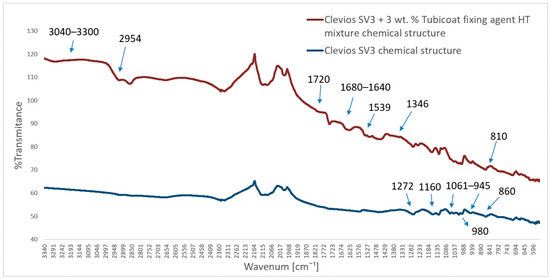 IR spectra of sample Clevios S V3 + 3 wt.% Tubicoat fixing agent HT can be found in melamine resin from the band between 3040 and 3300 cm−1, with poor signal intensity, suggesting the potential O–H bond stretching vibration and N–H stretching vibration in primary aryl amines. These bands demonstrated that the cross-linking of formaldehyde and melamine was successful. The stretching vibration of C–H corresponds to the band of 2954 cm−1. Additionally, the methane vibration is represented by the new peak at roughly 1346 cm−1 [63,65]. The wavenumbers of amino-substituted triazines, which would exhibit a distinct absorption band in the range 1680–1640 cm−1, can be because of the reduced number of unreacted amino groups in the resin structure. The absorption band at 810 cm−1 corresponds to the out-of-plane bending vibrations of C–H bonds. Another clue that a tiny amount of aldehyde is still not engaged in the cross-linking process of melamine resin is the faint signal detected at 1720 cm−1 (a band characteristic for the C=O group) (Figure 16).