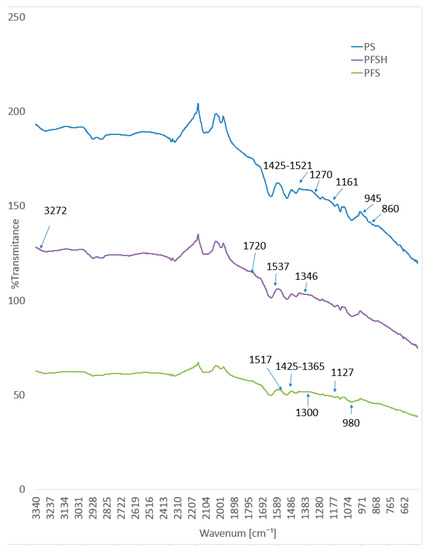 All of the peaks from the wool fiber covered with PEDOT:PSS were nearly identical to the pure film of PEDOT:PSS dispersion (Figure 17). The principal peaks of the sample (PS) absorption were located at 1161 cm−1 (sulfonic acid group of PSS), 1065–945 cm−1 (C–O–C stretching), 945 cm−1 and 860 cm−1 (C–S stretching), and 1270 cm−1 (C=C and C–C stretching of the quinoidal structure of PEDOT) [64]. Specific wavelengths of specific PEDOT:PSS absorption peaks were found in Clevios F ET and Clevios S V3 spectra. Peaks at 1127 cm−1 (sulfonic acid group) and 1425 cm−1 (corresponding to the C=C and C–C stretching vibrations coming from the thiophene ring) were also found, showing that the PEDOT:PSS was successfully interpolated on the surface of the wool fabric (Figure 17). Similar PEDOT:PSS peaks were found by Mingwei Tian et al. on cotton fabric surfaces at 1517 cm−1 and 1300 cm−1 [35]. Similar spectra to Figure 16 are found on sample PFSH near 3272 cm−1 and 1537 cm−1, 1346 cm−1 wavelength range. These results, when combined with the signal at 1720 cm−1, which represents the stretching vibrations of the C=O, may indicate that there are still a few unreacted O–H molecules in the polymer and a small amount of aldehyde that is not yet involved in the cross-linking of melamine resin [44,45,63] (Figure 17).
