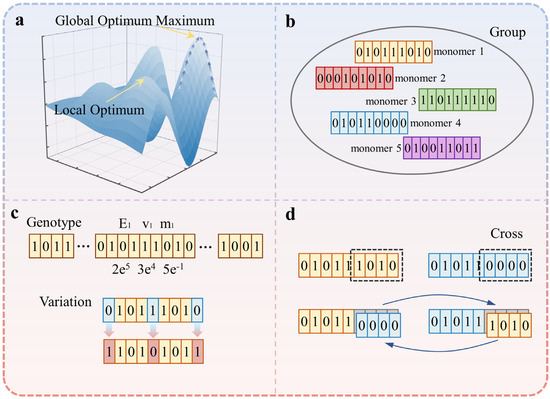 Theory of the genetic algorithm (GA): (a) global optimization; (b) population; (c) genotype and mutation; (d) crossover.