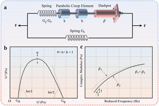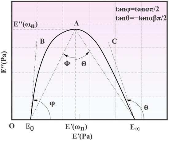 where k and h are the exponent indices, with 0 < k < h < 1; is a constant; is the static modulus at ; and is the glassy modulus at . As shown in Figure 2b, and are the intercepts of the Cole–Cole curve on the x-axis. is a constant. is defined as: