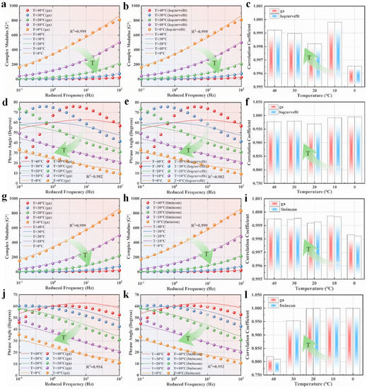 The secondary optimization is performed using the L–M algorithm, and the resulting fitted parameter values are shown in Table 6. The calculation process took 2.15 s. By substituting the optimized parameters obtained from the L–M algorithm into the 2S2P1D model, the dynamic modulus and phase angle are calculated. Figure 4g,h,j,k illustrate the experimental data and the corresponding calculated curves, while Figure 4i,l depict the correlation coefficients.