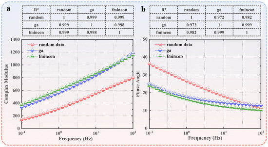 In this section, two commonly used viscoelastic models, including the 2S2P1D and H–N models, are applied. The formula of the H–N model contains high-order fractional derivatives, complex numbers, and generalized integrals, which place high demands on the selected upper and lower bounds of parameters. Thus, the direct optimization of the dynamic modulus and phase angle usually results in inaccurate values or even a large discrepancy between the solution and the fitting results due to the fact of inappropriate initial values.