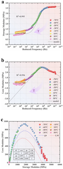 A reference temperature was adopted. Based on the optimized , the shift factors at each temperature and the reduced frequency could be calculated with Equations (21) and (22), respectively. Consequently, the experimental and data at different temperatures could be plotted at the reference temperature. Additionally, the H–N model can be employed to construct master curves based on the optimized parameters. Figure 6a,b illustrate these master curves. Furthermore, the parameters obtained using the GA and the L–M algorithm were back-calculated and plotted on the same coordinate system as the experimental data to form a Cole–Cole curve. A comparison was made to evaluate the fitting effect, as shown in Figure 6c.