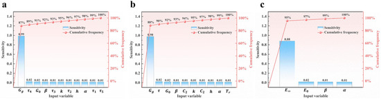 Pareto diagram of the sensitivity analysis of the input variables: (a) Pareto diagram of input variables in Method 1 of the 2S2P1D model; (b) Pareto diagram of input variables in Method 2 of the 2S2P1D model; (c) Pareto diagram of input variables in the H–N model.