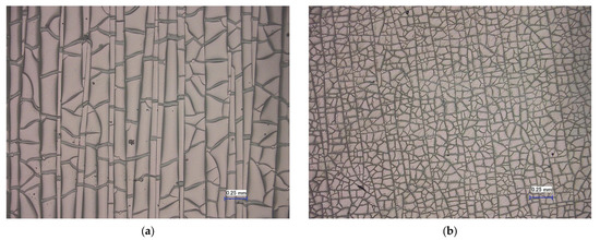 Thermal stressing of the PET/ITO samples shows no increase in resistance up to 100 °C, while the PC/ITO samples show similar sharp increases in electrical resistance and in mechanical stressing, indicating rapid crack propagation and/or increasing crack density in the layer. The formation of such cracks running through the entire sample, starting from the existing cracks in the edge region (introduced during sample preparation), was confirmed by microscopic examination (Figure 8b). The crack initiation temperatures are 58 °C and 83 °C for PC/ITO Trans B and PC/ITO Trans C, respectively (Figure 8a), and fit well with the curves in Figure 7 when extrapolated. Both results have high variance, which could originate from the size and density of the initial cracks due to sample preparation. Furthermore, in the case of thermal stress, a biaxial stress is present in the sample; meanwhile, in the case of tensile stress, it is only uniaxial.