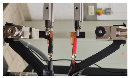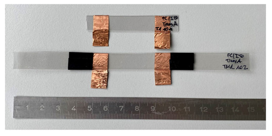 The samples were cut using a scalpel, and a copper tape (AT526, 10 mm × 0.035 mm, Advance Tapes International Ltd., Thurmaston, UK) was applied to produce more conductive bonding points. Conditioning was carried out in a climatic test chamber 3433 (Feutron, Langenwetzendorf, Germany) for 24 h at a humidity of 50% and a temperature of 23 °C.